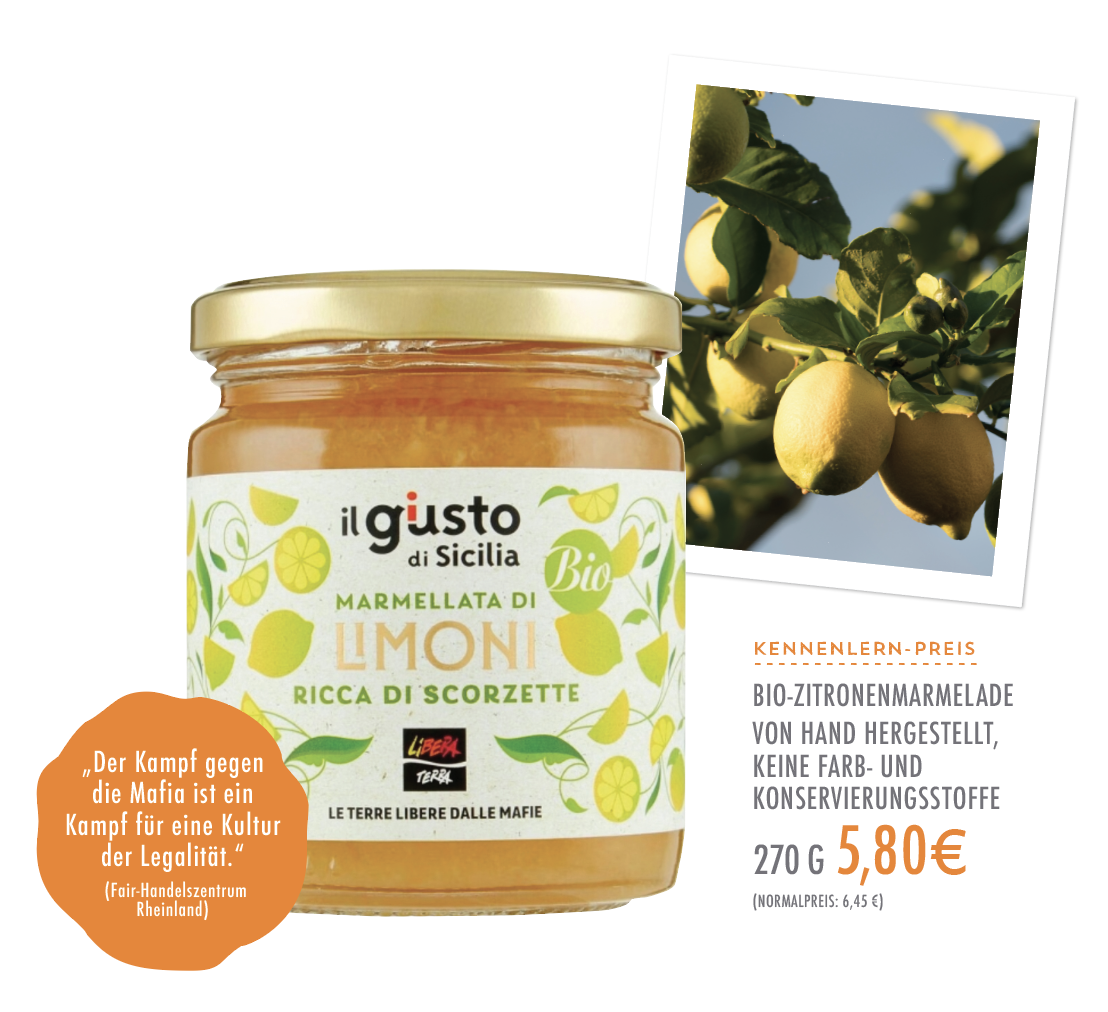 Das Produkt des Monats gibt es jeden Monat zum Kennenlernen zu einem Sonderpreis: Bio-Zitronenmarmelade, 270 g, Normalpreis 6,45 €, Angebotspreis 5,80 €.