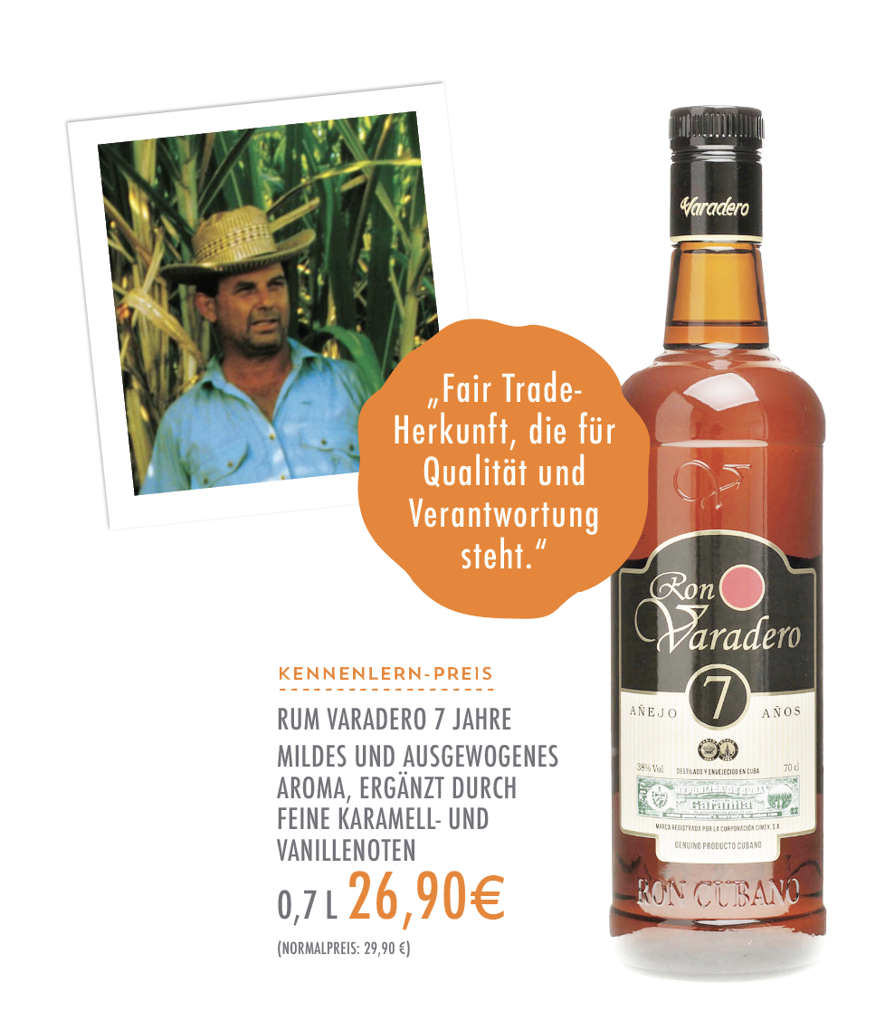 Das Produkt des Monats gibt es jeden Monat zum Kennenlernen zu einem Sonderpreis: Rum Varadero 7 Jahre, 0,7 l, Alkoholgehalt 38%, Normalpreis 29,90 €, Angebotspreis 26,90 €.