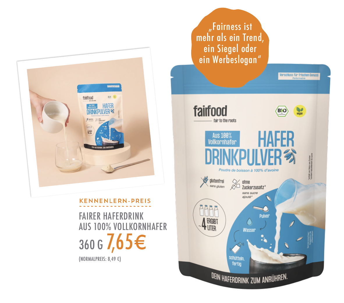 Das Produkt des Monats gibt es jeden Monat zum Kennenlernen zu einem Sonderpreis: Fairer Haferdrink, 360 g, Normalpreis 8,49 €, Angebotspreis 7,65 €.
