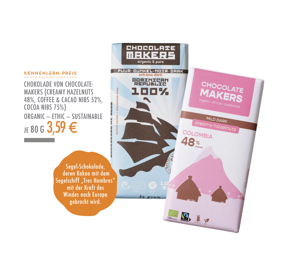 Das Produkt des Monats gibt es jeden Monat zum Kennenlernen zu einem Sonderpreis: Schokolade von Chocolatemakers (Creamy Hazelnuts 48%, Coffee & Cacao Nibs 52%, Cocoa Nibs 75%), jeweils 80 g, Normalpreis 3,99 €, Angebotspreis 3,59 €.