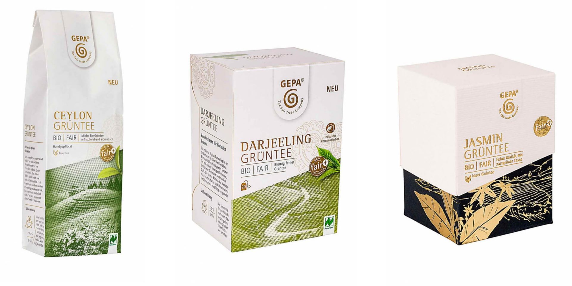 Die GEPA hat ihr Teesortiment erneuert und erweitert. Es gibt Neuheiten, verbesserte Rezepturen, konsequentere Umsetzung der Prinzipien des Fairen Handels und ein neues Verpackungsdesign. Das Basissortiment umfasst 12 verschiedene Schwarz, Grün, Kräuter- und Früchtetee Sorten. Hinzu kommt ein Kernsortiment von 20 verschiedenen Teesorten: Wellness Tees, verschiedene Varianten von Schwarz und Grüntees in Teebeuteln und Spezialitäten wie Assam und Earl Grey. Zum Premiumsortiment zählen drei Tees in handgefertigten Verpackungen: der Darjeeling First Flash, der Weißtee Darjeeling und der Jasmin Grüntee. In der Papiermanufaktur „Fibres“ in Neu Delhi werden für diese Spezialitäten die besonderen Verpackungen aus handgeschöpftem Recyclingpapier hergestellt. Den Rohstoff bilden Baumwollreste, die zerkleinert, gereinigt und zu einer Masse verarbeitet werden, aus der die einzelnen Blätter per Hand geschöpft werden. Auch die Verpackung der Teebeutel hat sich geändert. Die Folie besteht zu über 90 Prozent aus nachwachsenden Rohstoffen (Holzzellstoff und anderen Materialien aus FSC-zertifizierter Forstwirtschaft). Die neue Folie ist industriell kompostierbar. Die Tees aus Indien, Sri Lanka und Vietnam werden per Hand gepflückt und alle Tees vor Ort weiterverarbeitet. Die gestiegenen Preise besonders für den DarjeelingTee beruhen auch darauf, dass die Löhne für die Arbeiter*innen um 30 Prozent gestiegen sind, für die Menschen dort eine gute Entwicklung.