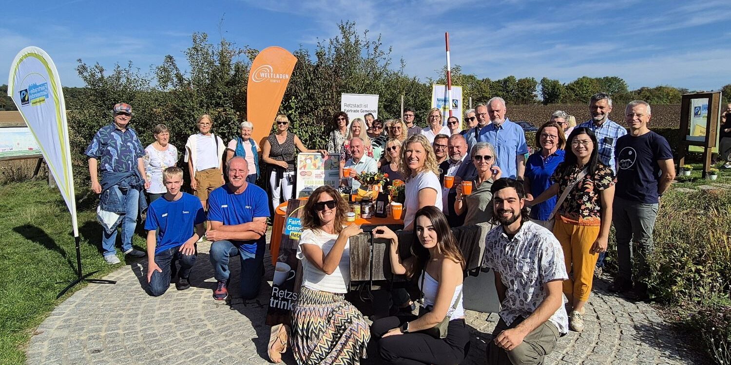 Bildunterschrift: „Faires Frühstück am Mittelpunkt der EU“: Ein buntes Fest der Vielfalt und des Engagements für den Fairen Handel feierten die Teilnehmenden aus Güntersleben, Retzstadt, Rimpar und Veitshöchheim gemeinsam mit Landrat Thomas Eberth und den Bürgermeisterinnen und Bürgermeistern der Gemeinden.