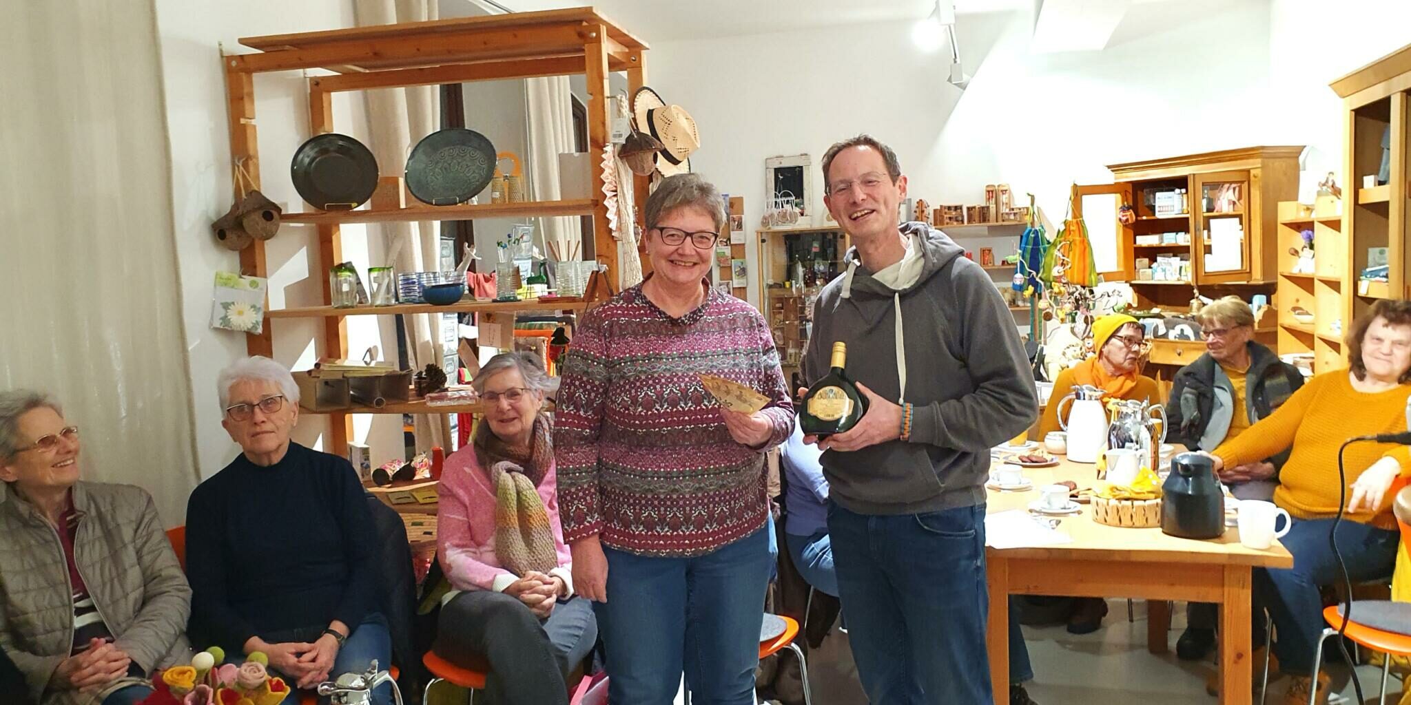 Bildunterschrift: Mitglieder des Katholischen Frauenbundes Rimpar lauschten im Weltladen interessiert dem Vortrag von Dr. Alexander Thumbs über seinen medizinischen Einsatz in Malawi und Kenia. Vorsitzende Birgitt Dod überreichte 200 Euro als Spende für den Verein Tionana – Hilfe zur Selbsthilfe in Malawi e.V.