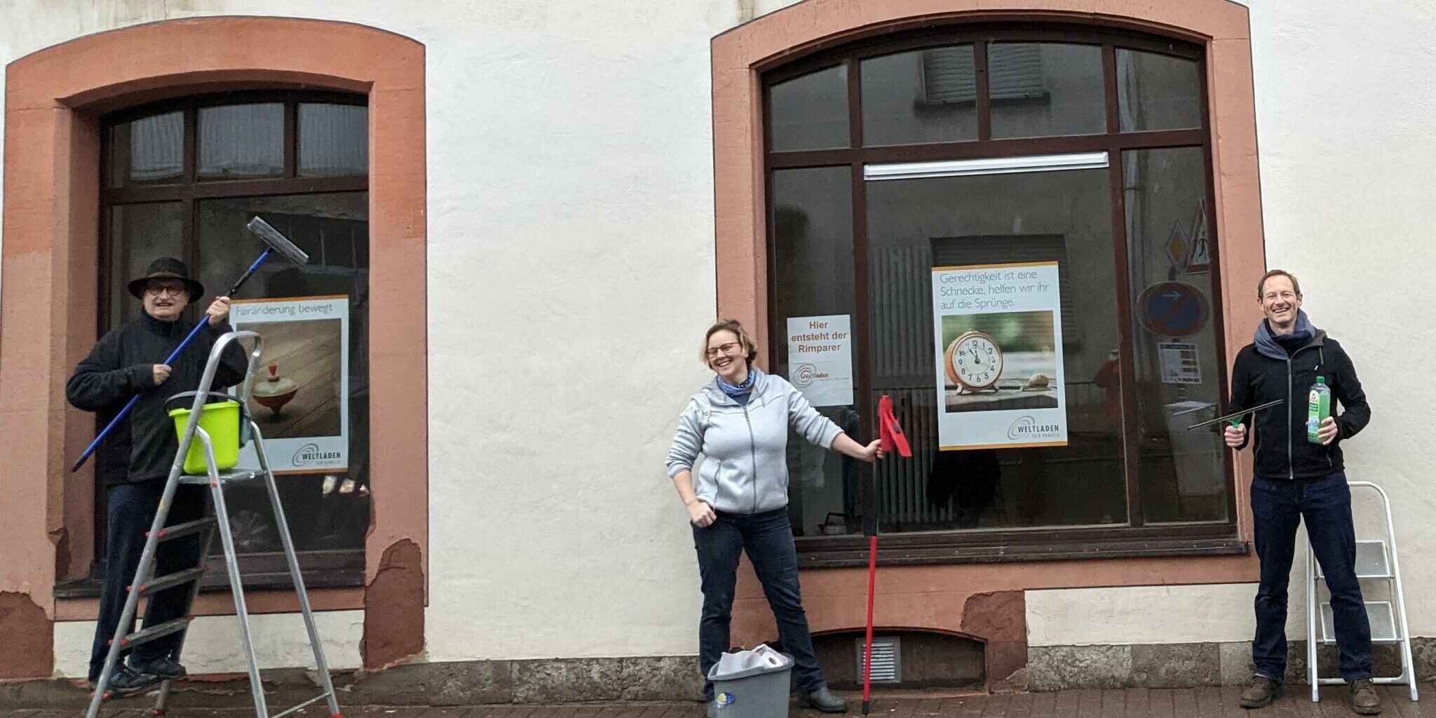 Schritt für Schritt entwickelt sich der Weltladen in Rimpar! Ein fleißiges Team mit Dr. Eva-Maria Speth, Xaver Schorno und Dr. Alexander Thumbs ließen sich nicht vom nass-kalten Wetter abhalten und putzen fleißig die Schaufenster des Ladens, damit die ersten Informationsplakate noch schöner wirken. In naher Zukunft müssen noch kleinere Renovierungsarbeiten erledigt werden, parallel hierzu ist der Verein Weltladen Rimpar e.V. aber schon hoch engagiert bei der Sache – Konto, Homepage, Sponsoren, Möbel, erste Produkte, die Organisation des ehrenamtlichen Verkaufs… die Liste an Aufgaben ist lang, wird aber mit Freude und Spaß erledigt, sodass wir hoffen, dass die Eröffnung des Ladens in naher Zukunft gelingt!