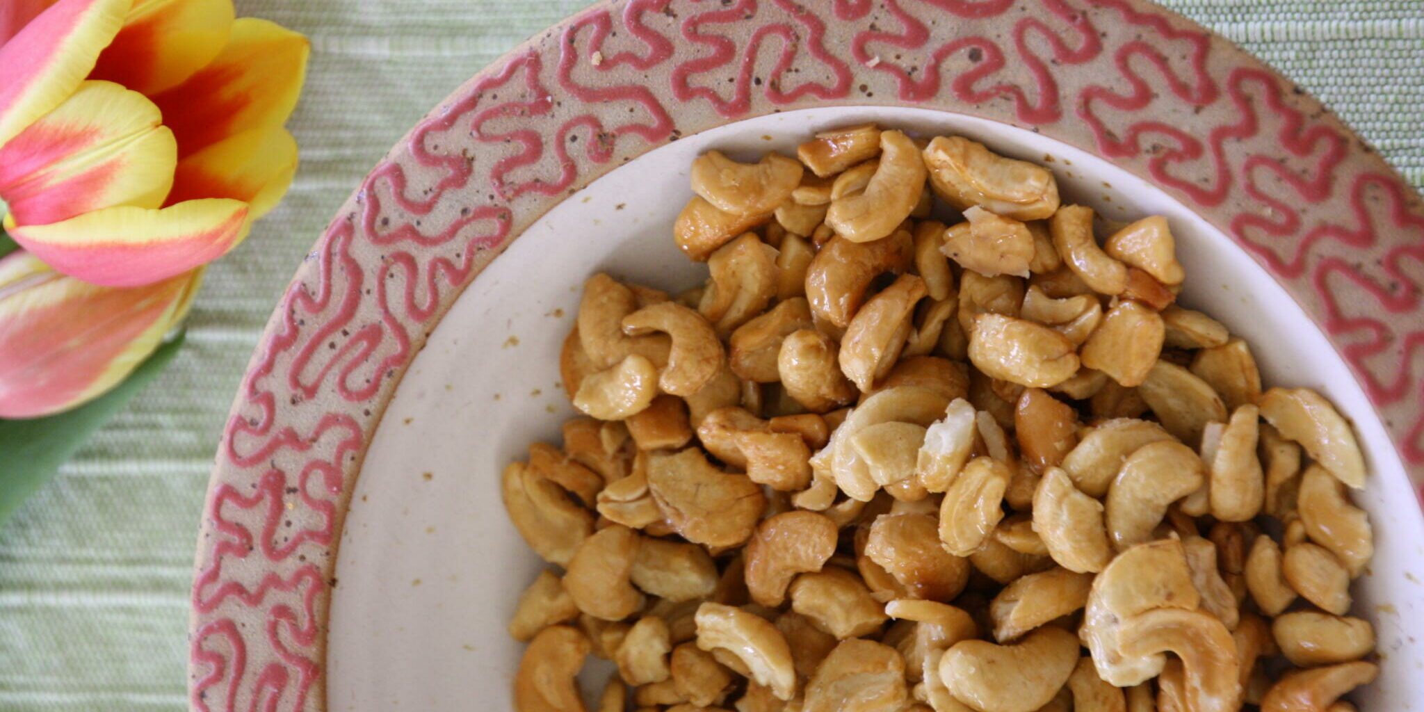 Butter und Honig in einem Topf bei kleiner Hitze schmelzen lassen. ½ EL Salz und Cayennepfeffer einrühren, dann die Cashewkerne dazu geben und alles sehr gut verrühren.