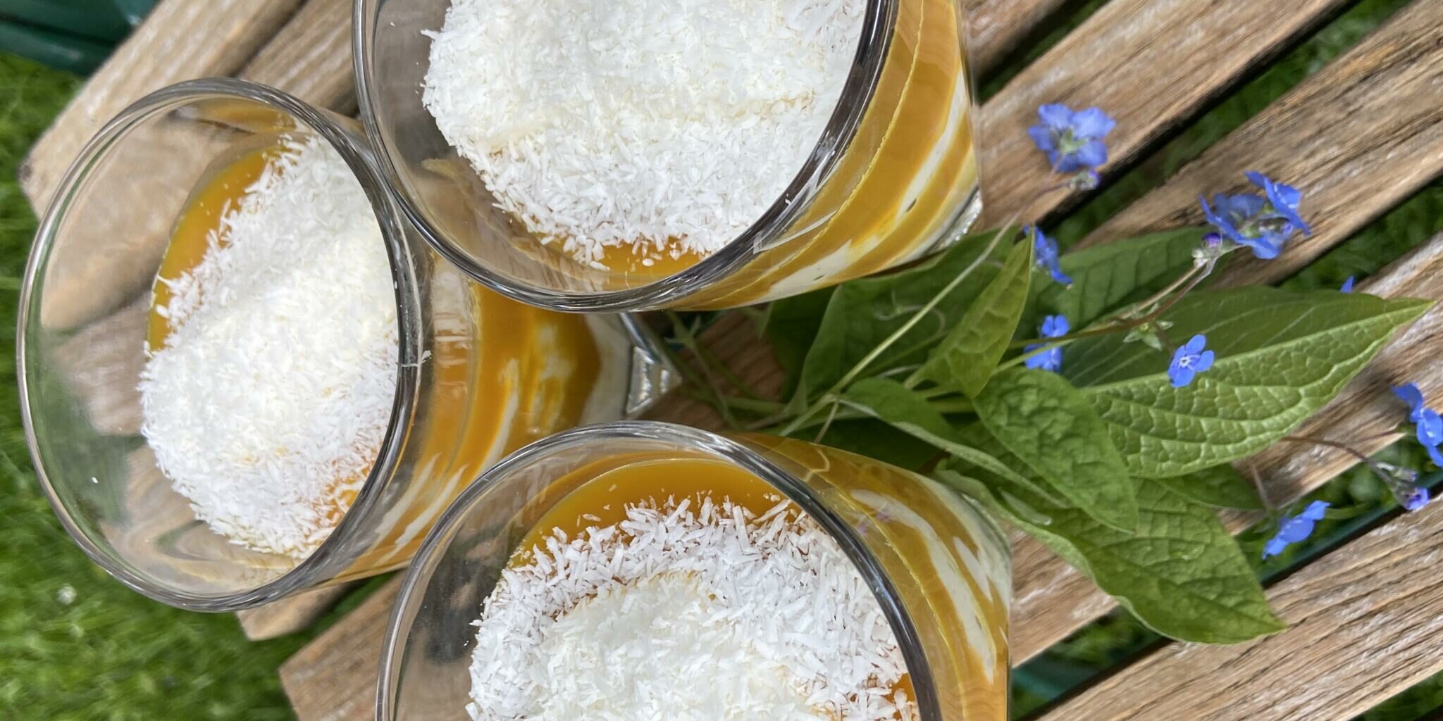 Vier Dessertgläser schichtweise mit dem Mango Sirup und der Kokoscreme füllen.