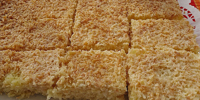 Für den Belag den Rohrzucker mit Kokosflocken verrühren und gleichmäßig auf dem Teig verteilen.