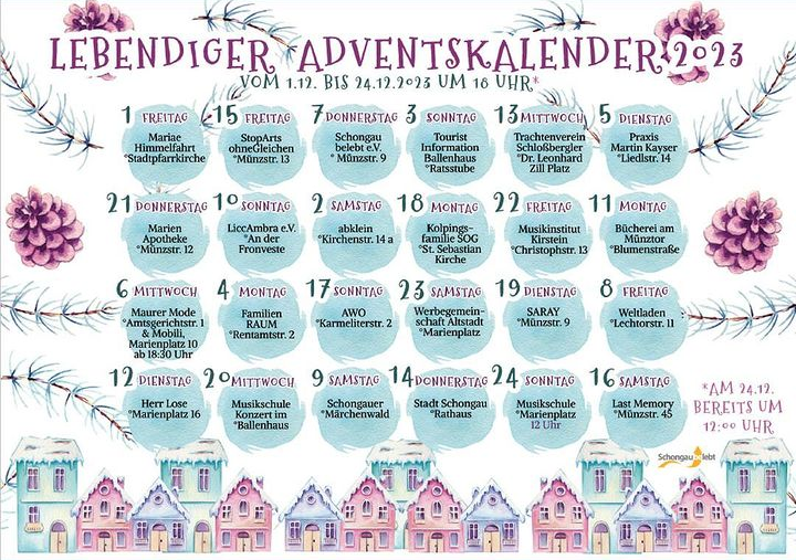 Der Lebendige Adventskalender begleitet wieder die Schongauer und die Besucher unserer Stadt durch den Advent. Wir vom Weltladen öffnen das ‚Türchen‘ am 8.12. um 18 Uhr mit einer Kurzgeschichte und Punsch und freuen uns auf Ihr Kommen. Im Weltladen können Sie zudem gerne den Adventskalender mit der Übersicht der Veranstalter mitnehmen.