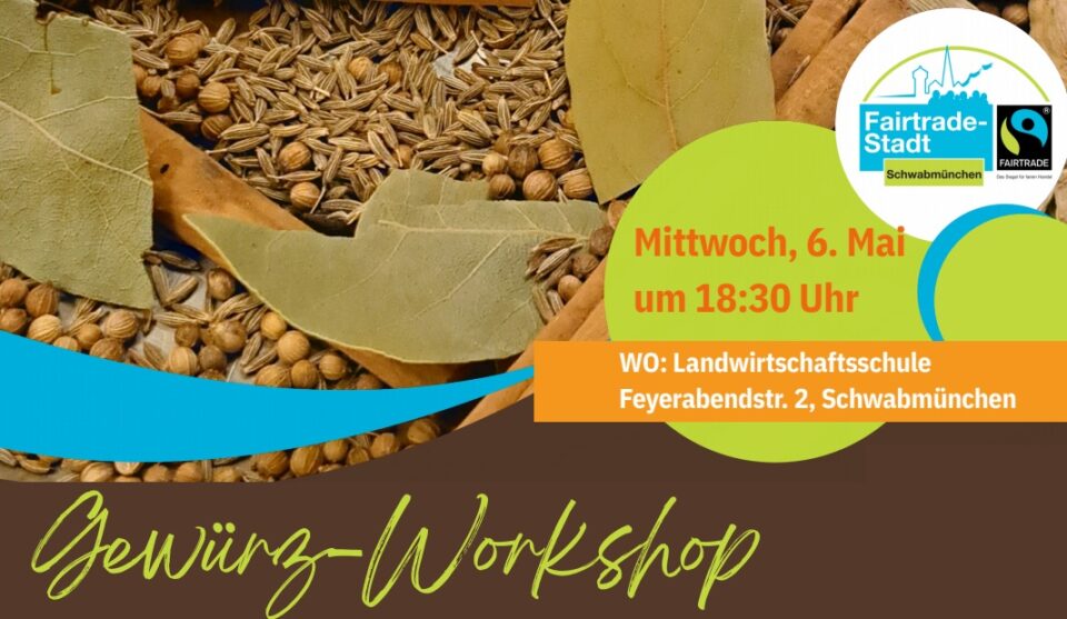 Der Gewürz-Workshop entführt Sie in die Welt der Aromen. Sie riechen und schmecken die Vielfalt von Gewürzen aus aller Welt und mischen selber kräftig mit. Schließlich nehmen Sie Ihre Gewürzmischung und Rezeptideen mit nach Hause. Teilnahmebeitrag: 10,00 €, Tickets im Weltladen. Der Workshop wird veranstaltet vom Weltladen Schwabmünchen in Kooperation mit der Steuerungsgruppe Fairtrade Stadt.…