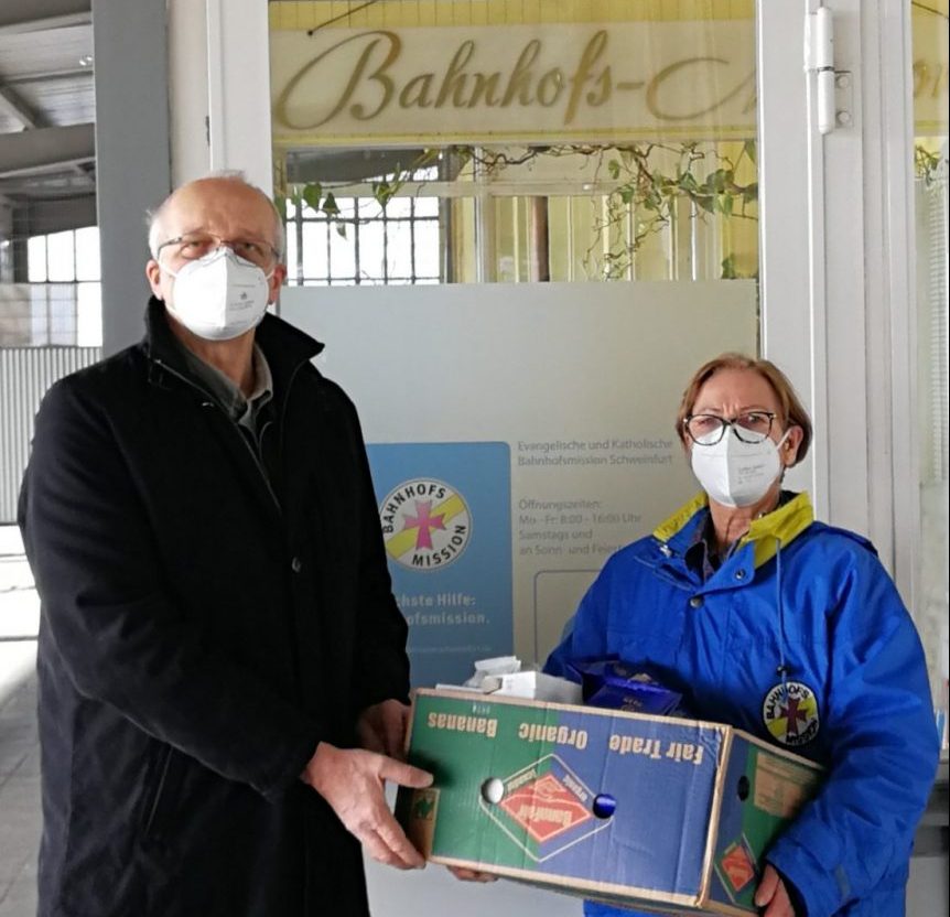 Der Weltladen Schweinfurt hat deshalb Kaffee, Tee und Kekse – selbstverständlich fair gehandelt – aus seinem Sortiment als Spende an die Bahnhofsmission weitergegeben, um diese wichtige Einrichtung zu unterstützen. Ingeborg Fuchs von der Bahnhofsmission, die die Spende entgegennahm, zeigte sich sehr erfreut und bedankte sich herzlich bei Barbara Leyrer vom Weltladen und Andreas Leyrer vom Verein Fair handeln Schweinfurt e.V., der die Spende überreichte.