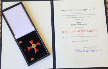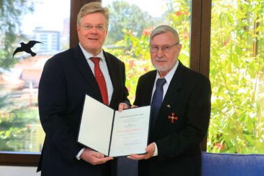 Sicherlich habt Ihr es mitbekommen, da ja die Schwäbische Zeitung darüber berichtet hat: für unsere erfolgreiche Projekt-Arbeit hier in El Salvador wurde ich am vergangenen Donnerstag in der hiesigen Botschaft mit einer Urkunde vom deutschen Bundespräsidenten und dem Bundesverdienstkreuz geehrt. Laut deutscher Botschaft ist dies nicht das übliche Bundesverdienstkreuz am Bande, sondern eines 1. Klasse und damit die höchste Auszeichnung für zivile Ordensträger. Ich persönlich wusste bisher nicht, dass es solche Unterschiede gibt. Da der Erfolg unseres Projektes vor allem auch solch Unterstützern wie Euch zu verdanken ist, möchte ich es jedoch nicht versäumen, Euch ein paar Bilder von diesem speziellen Ereignis zu schicken, zu dem ich alle meine MitarbeiterInnen mitgenommen hatte, die sich total in Schale geschmissen hatten (zum Glück gabs was zum Ausleihen; auch ich musste mir einen Anzug leihen), damit Ihr nachträglich ebenfalls noch ein bisschen „mitfeiern“ könnt. Nochmals vielen Dank für Eure Unterstützung.