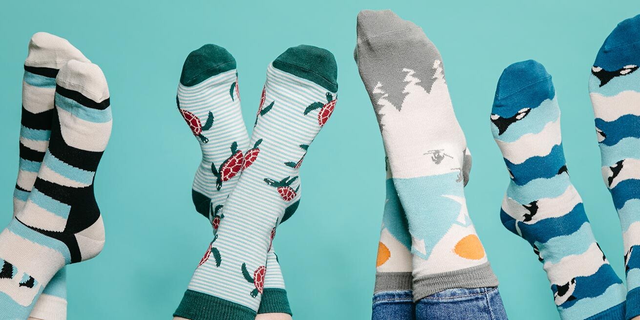 Was haben bunte Streifen und Punkte, Hunde und Katzen, Stieleis und Latte macchiato, Sportler und Fahrräder gemeinsam? Alle Motive zieren die fröhlichen, langlebigen Socken aus Bio-Baumwolle, die sich nicht unter Hosenbeinen verstecken müssen.