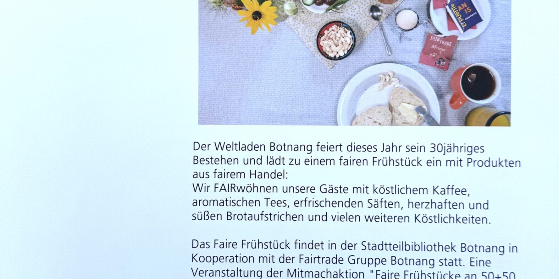Am Samstag, den 27. September findet in der Stadtteilbibliothek Botnang unser Faires Frühstück statt. Wir FAIRwöhnen Sie mit köstlichem Kaffee, aromatischen Tees, erfrischendem Mango-Apfelsaft, herzhaften und süßen Brotaufstrichen und vielen weiteren Köstlichkeiten zum FAIRkosten. Diese Aktion findet in Kooperation mit der Fairtrade Gruppe Botnang statt.