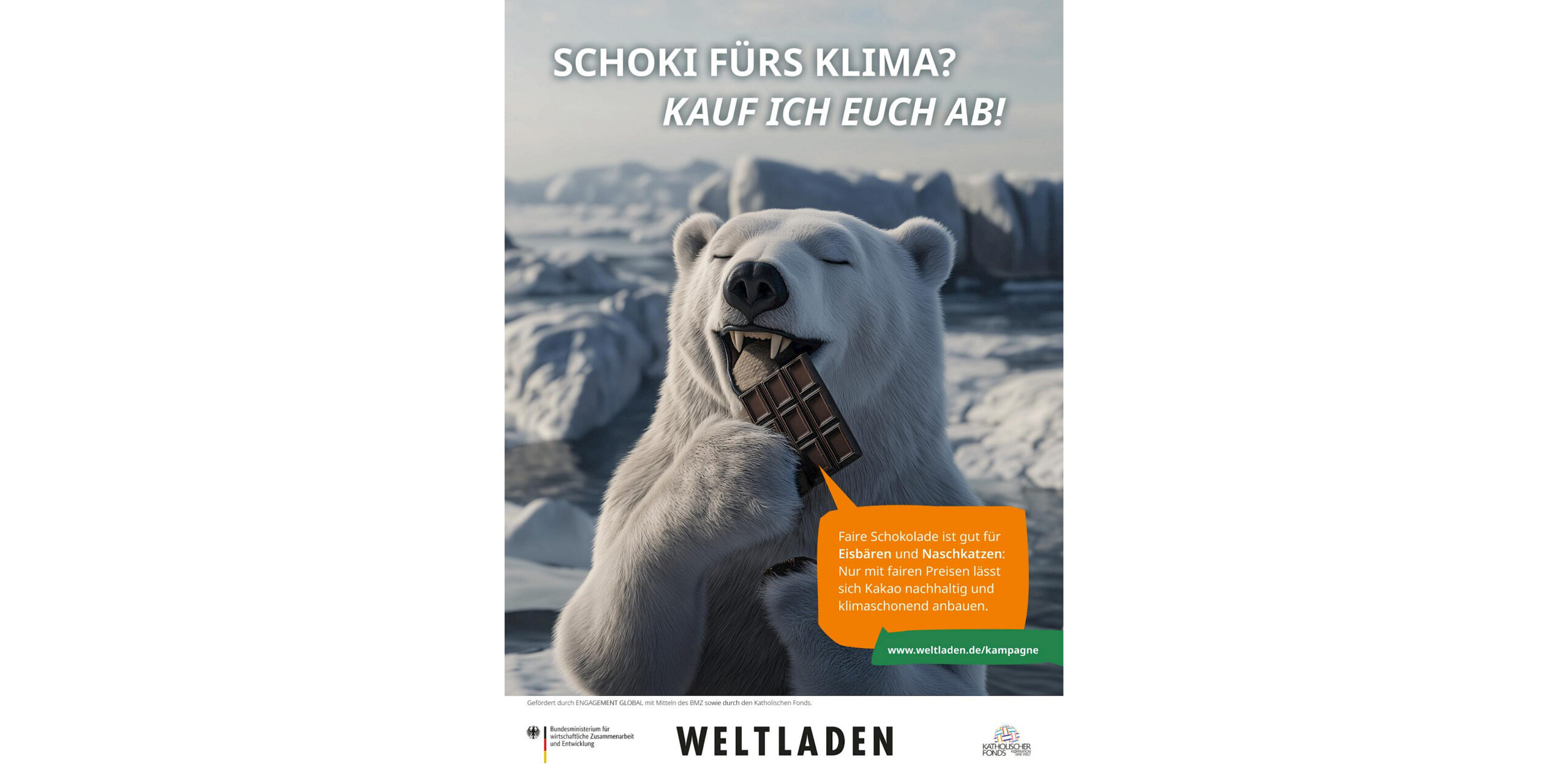Der Eisbär aber auch die Erklärung „Faire Schokolade ist gut für Eisbären und Naschkatzen: Nur mit fairen Preisen lässt sich Kakao nachhaltig und klimaschonend anbauen“ ist eine Aktion der Weltladeninitiative. Mehr Infos unter: www.weltladen.de/kampagne – die Aktion wird gefördert durch ENGAGEMENT GLOBAL mit Mitteln des BMZ sowie durch den Katholischen Fonds.