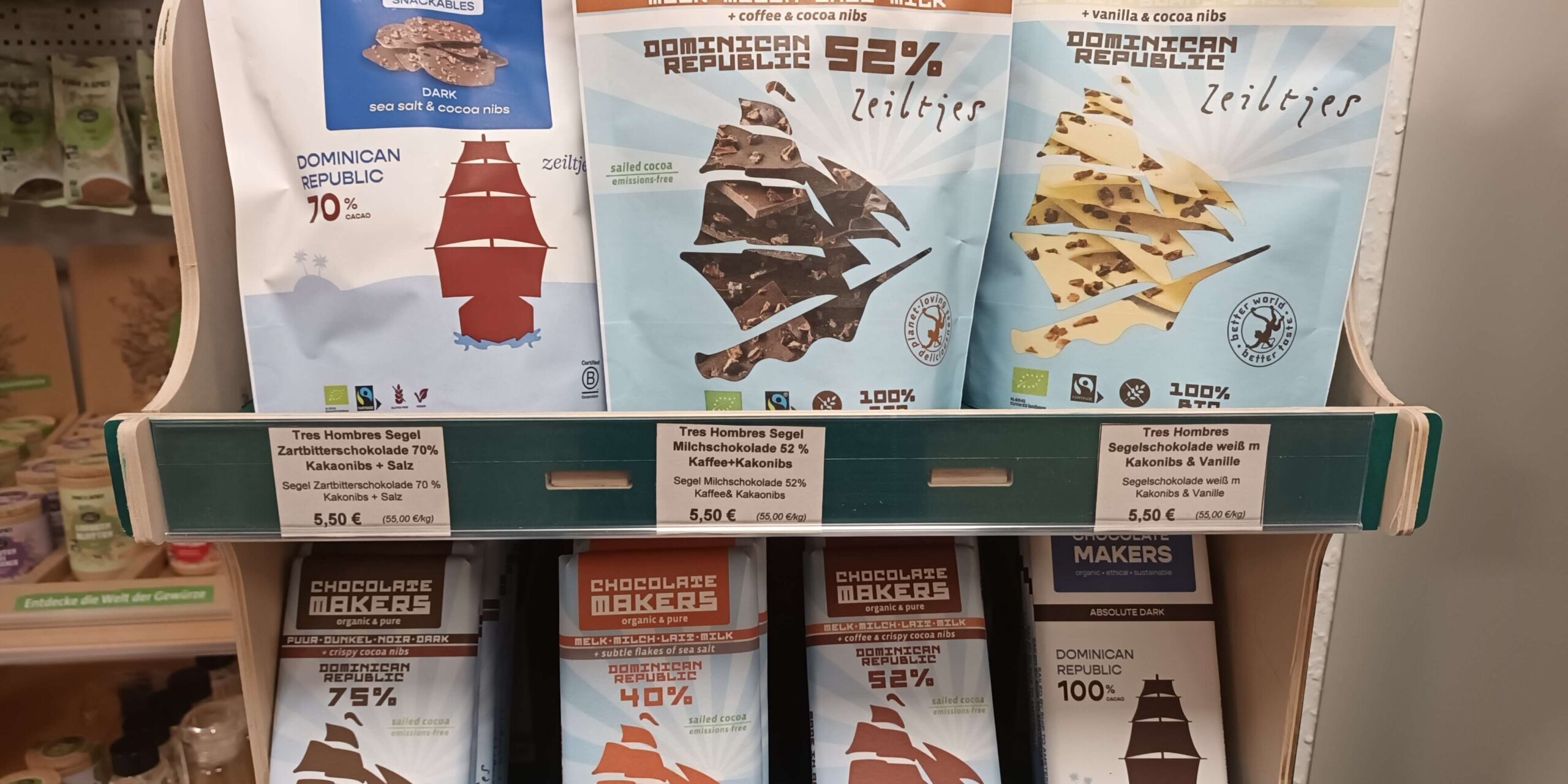 Die Segelschokolade von den Chocolatemakers aus Amsterdam ist ein Paradebeispiel für nachhaltige und klimaneutrale Lebensmittelproduktion. Sie zeichnet sich durch den Transport per Segelschiff über den Atlantik und die Herstellung mit Solarstrom aus.