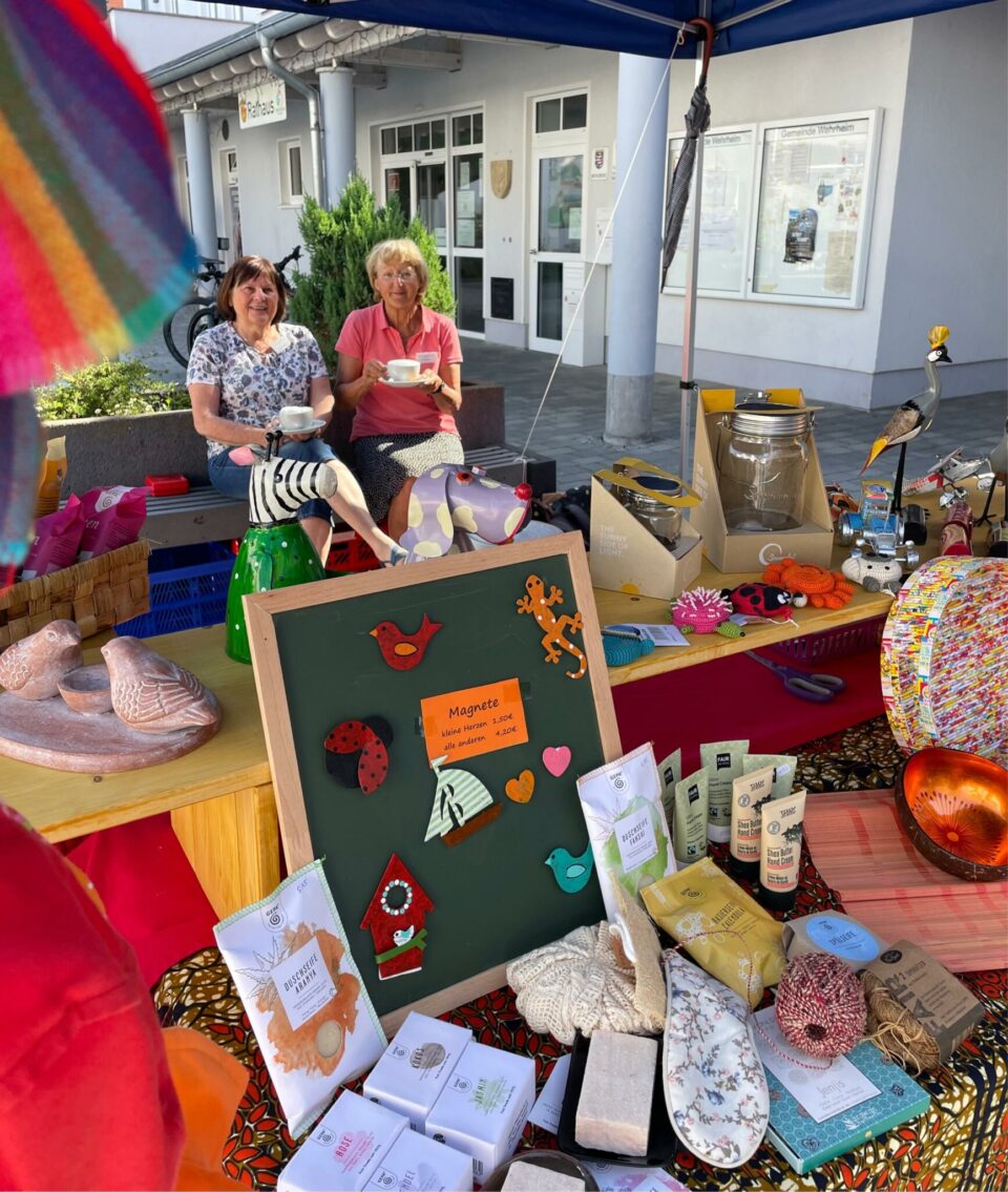 Wir stehen mit einem Weltladen Stand immer am 1. Donnerstag im Monat, wenn trockenes Wetter ist, auf dem Wochenmarkt in Wehrheim. Das sind im Sommer 2026 folgende Termine: Donnerstag, 7. Mai Donnerstag, 11. Juni Donnerstag, 02. Juli Donnerstag, 06. August