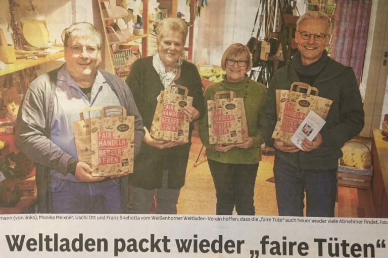 Weltladen startet Fasten-Aktion „Faire Tüten” – das Plus mit Genuss Jede Woche eine Tüte mit fair gehandelten Lebensmitteln: Mit dieser Aktion will der Weißenhorner Weltladen in der siebenwöchigen Fastenzeit ab Aschermittwoch dafür werben, das eigene Konsumverhalten zu überdenken. Die Kunden sollen sich fragen, ob sie alle Produkte in der „Billig-Variante“ brauchen, sagt Franz Snehotta,…