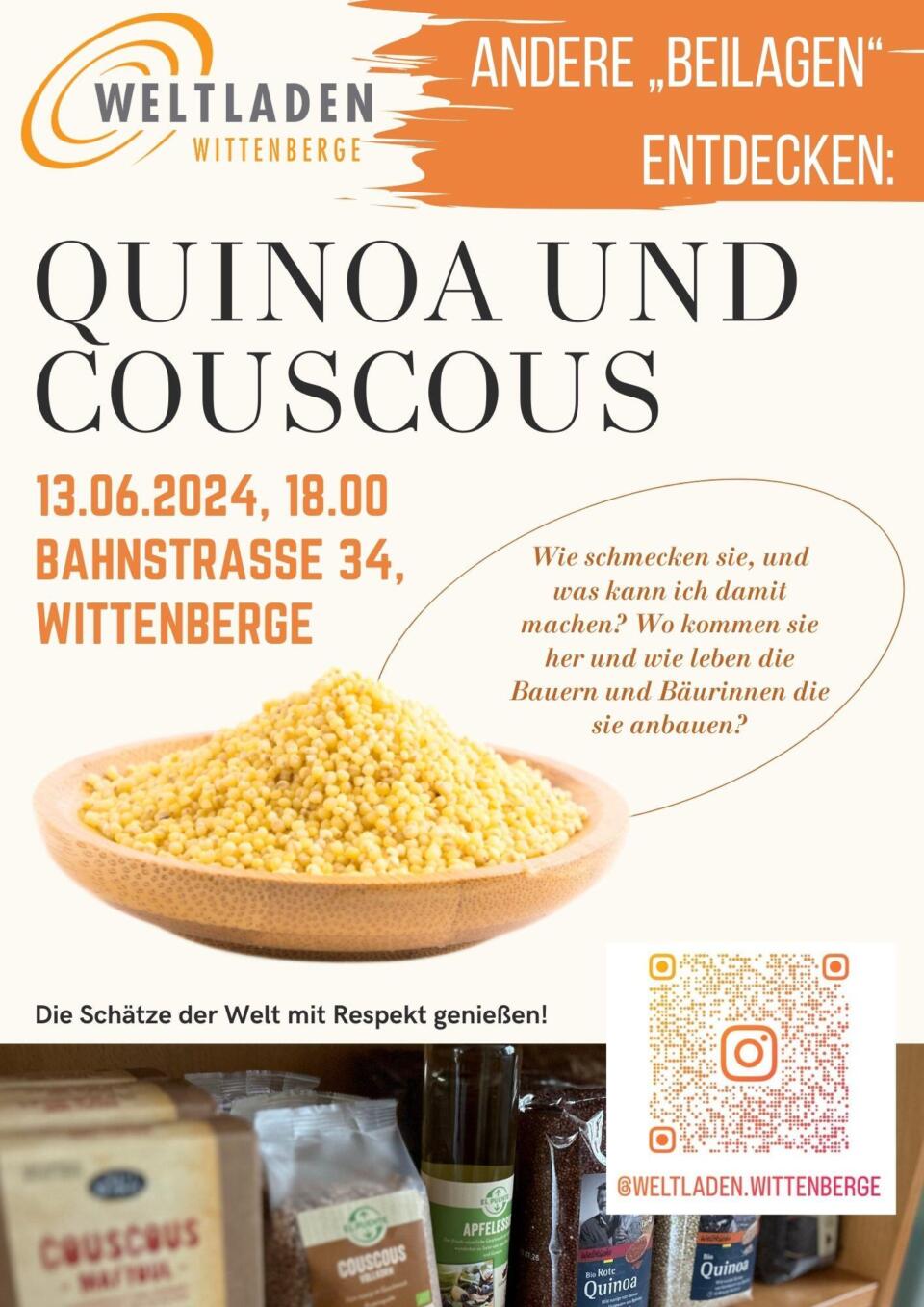 Wie schmecken sie, und was kann ich damit machen? Wo kommen sie her und wie leben die Bauern und Bäurinnen die sie anbauen? Erfahren Sie mehr über Couscous und Quinoa Die Schätze der Welt mit Respekt genießen! Wir laden ein zu gemütlichen Abenden, an denen wir Leckereien verkosten, etwas über ihre Herkunft erfahren und ins…