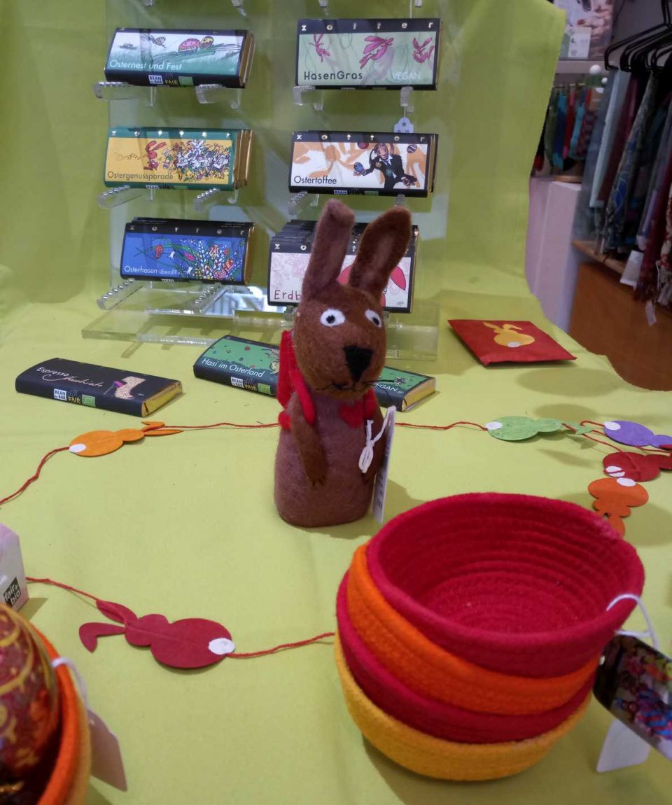 Das Schaufenster wurde für den Osterverkauf neu dekoriert. Es gibt nicht nur leckere Schokolade von Zotter sondern auch viele kunstgewerbliche Artikel, u.a. Hasen, Hühner und bunt bemalte Eier.