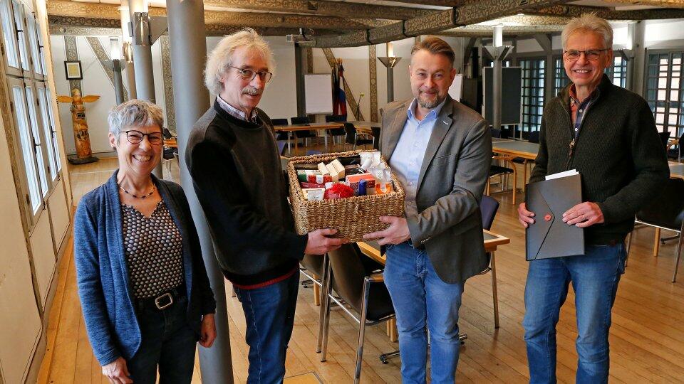 Noch kurz vor Weihnachten konnten Vertreter*innen des Vereins Werkstatt Solidarische Welt e.V. Bürgermeister Lukanic einen fairen Geschenkkorb überreichen. Ziel der Aktion war es, verschiedenen Ämtern der Stadt zu zeigen, welche Produkte sich als Geschenke zum Beispiel bei Jubiläen, im Rahmen von Städtepartnerschaften oder kulturellen Events eignen. Finanzielle Unterstützung für dieses Geschenk erhält der Weltladen Wolfenbüttel…