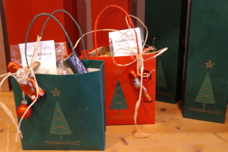 Unsere Mitarbeiterinnen haben verschiedene Musterkörbe und -taschen für Sie gepackt. Gerne stellen wir sie Ihnen auch nach Ihren individuellen Wünschen zusammen.